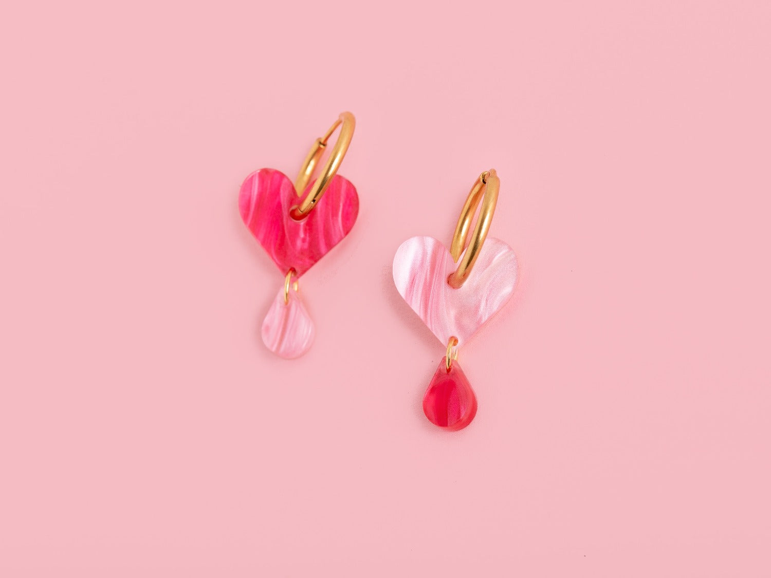 Mismatch Heart Hoop Earrings in Colorblock Pink
