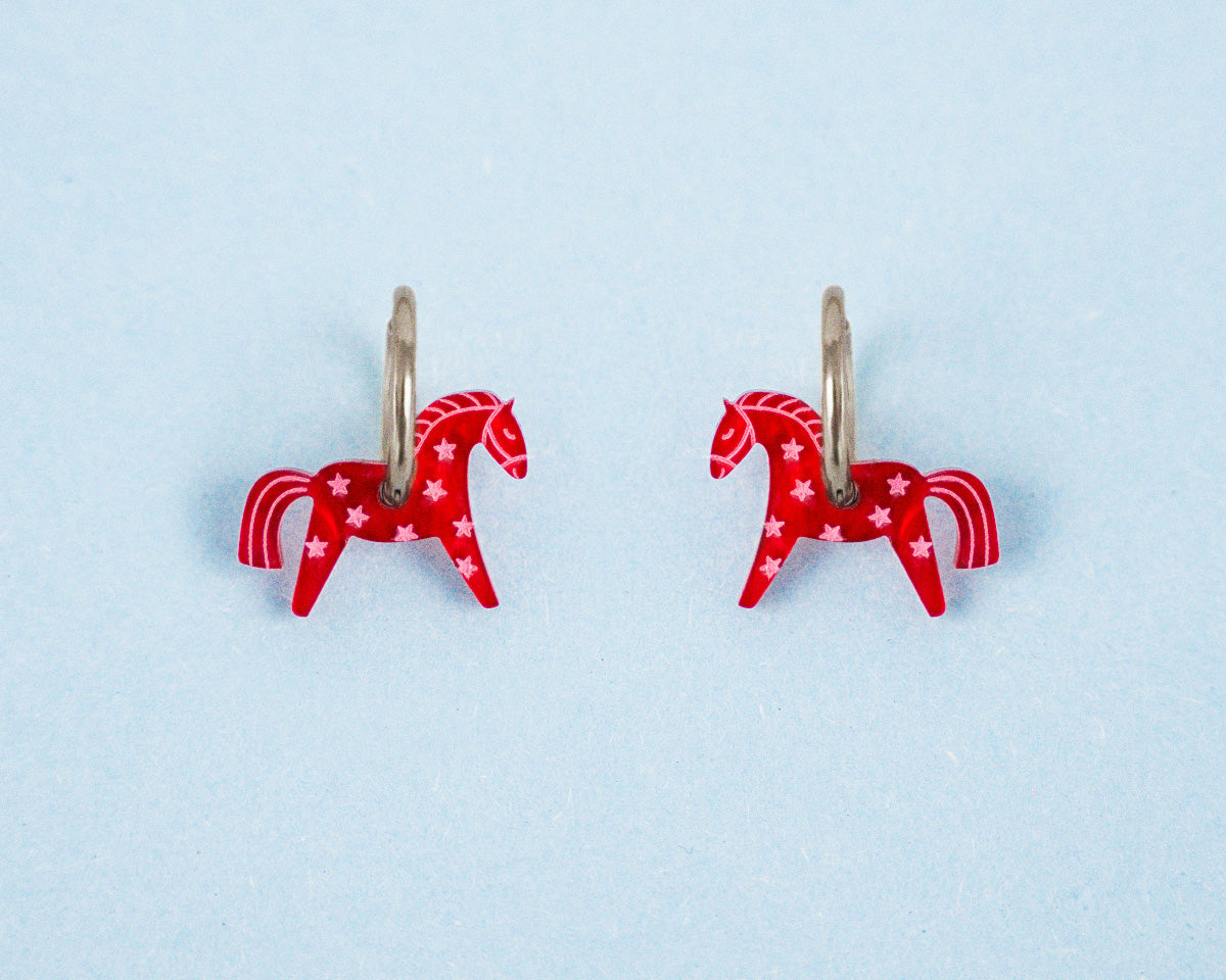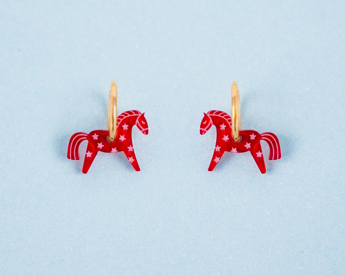 Our earring set combines high-quality stainless steel hoops with a little horse made of red mother-of-pearl acrylic. The tiny pink stars are hand-painted, making each pair a unique little work of art.