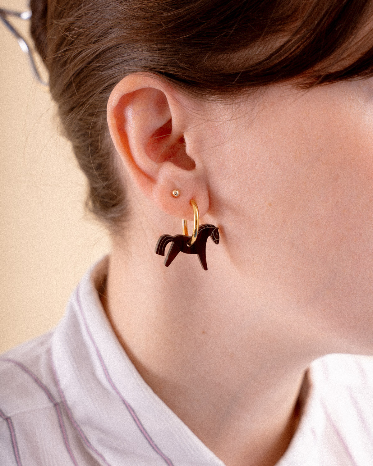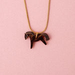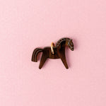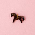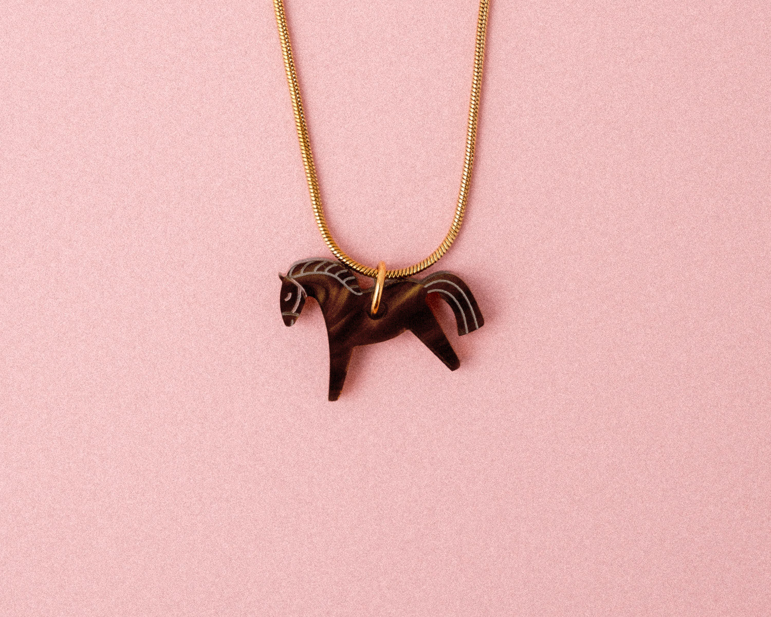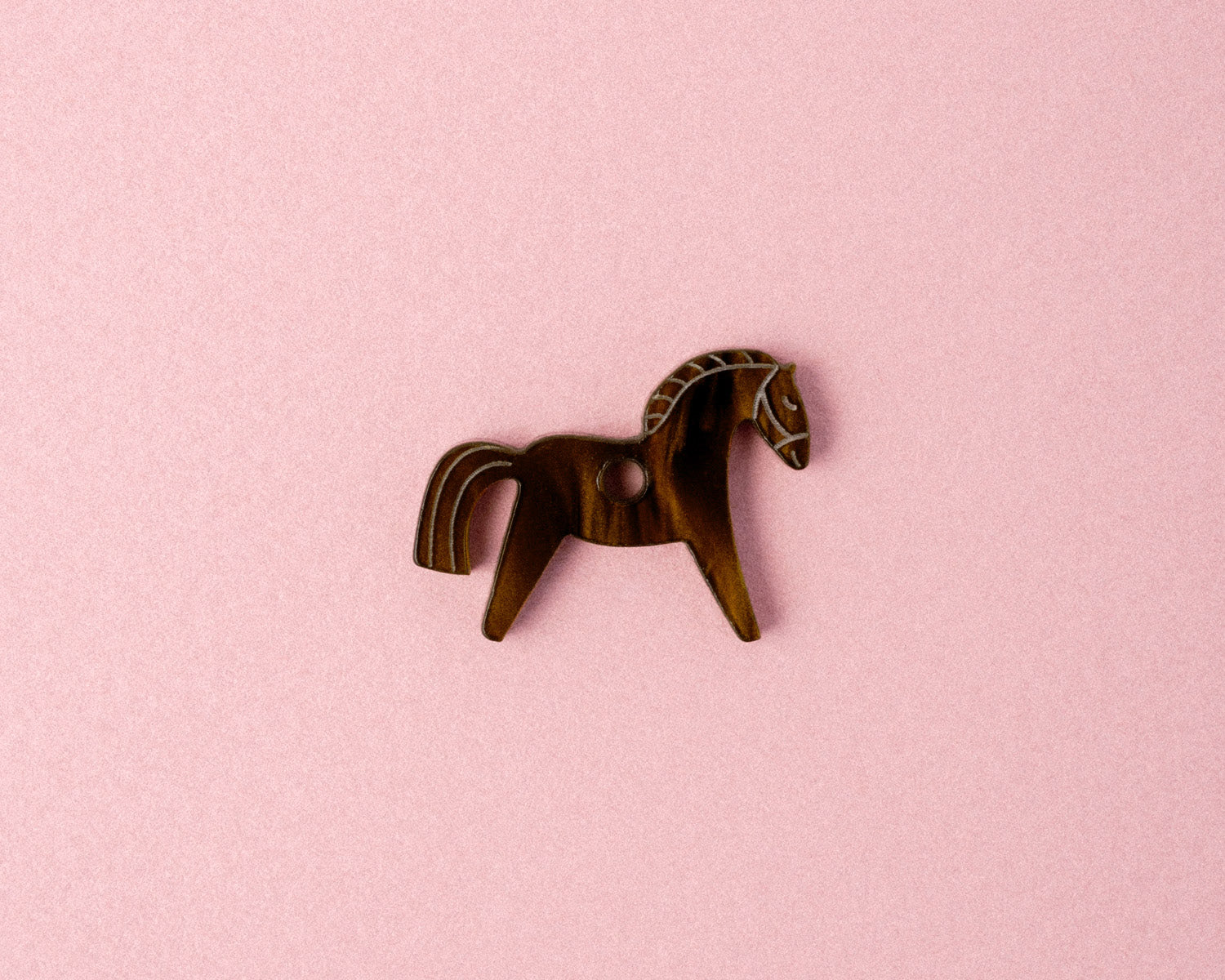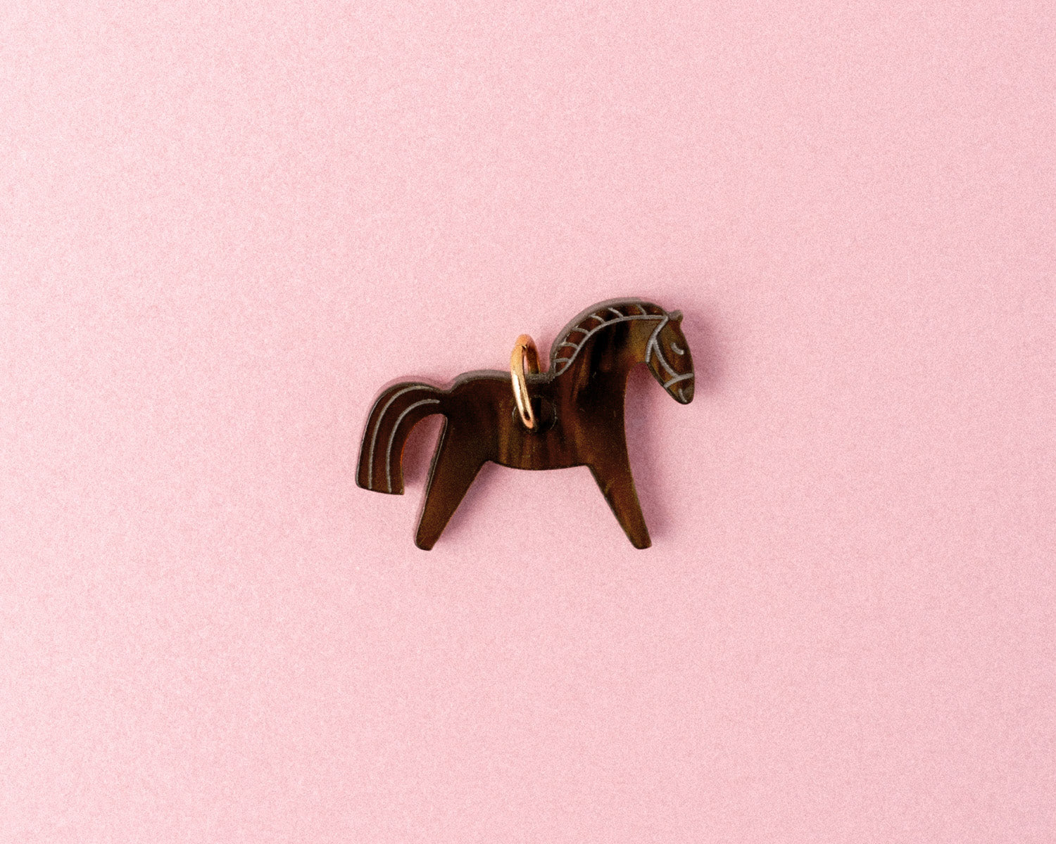 Unser brauner Pferdchen-Anhänger besteht aus hochwertigem braunem Perlmutt-Acryl mit einem sanft schimmernden Finish.