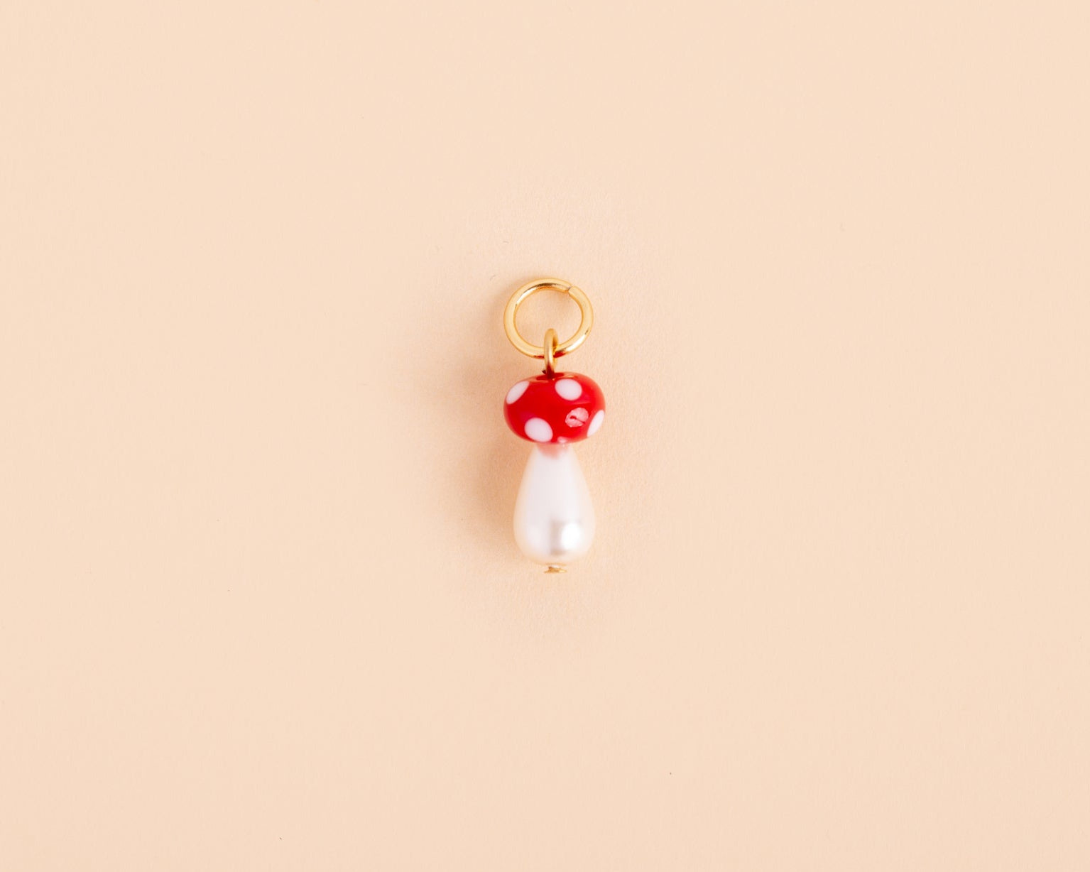 Eine handgemachte Murano Glasperle und perlmuttfarbene Glaswachsperle ergeben kombiniert diesen süßen kleinen Pilz.