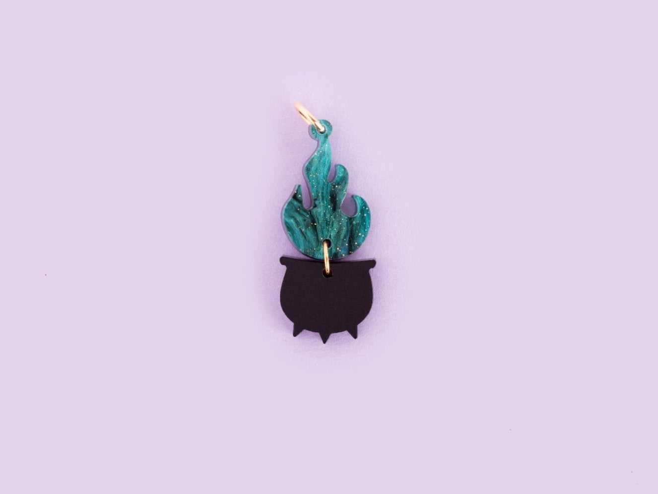 Kleiner Hexenkessel in mattem schwarz, aus dem ein Hexenfeuer kommt in grün-schwarze marmoriertem Perlmutt Acryl.