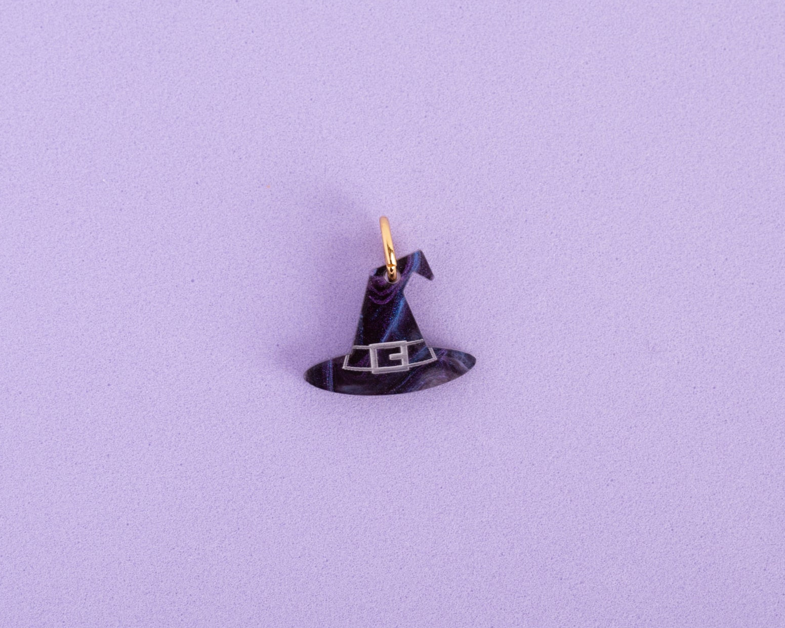 Kleiner Hexenhut Anhänger aus lila-blau schimmerndem Perlmutt-Acryl.