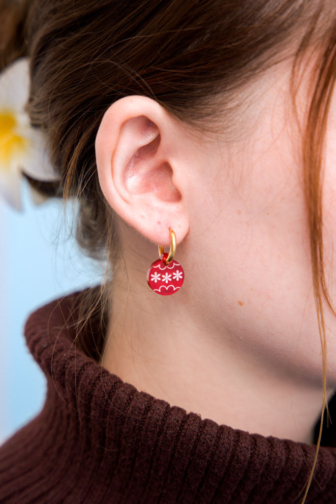 Warum finden wir Acryl so klasse? Es kommt in vielen Farbtönen und Mustern, ist sehr vielseitig und vor allem: Super leicht. Du kannst also selbst große Ohrringe den ganzen Tag problemlos tragen und wirst sie kaum spüren. Unsere größten Ohrringe wiegen pro Ohrring 2 Gramm! Aber keine Sorge, auch unsere Messing Ohrringe sind noch sehr leicht.