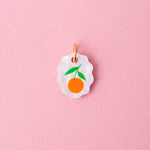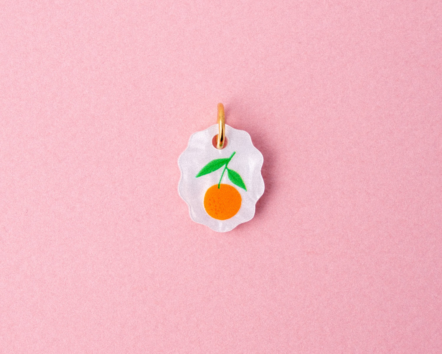Ein kleiner Orangen-Anhänger mit Vintage-Anmutung. Die Amulettform mit welligem Muschelrand trifft auf ein klares, grafisches Motiv in Orange und Grün, das auf perlmuttweißes Acryl gedruckt ist.