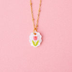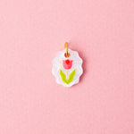 Ein kleiner Tulpen-Anhänger mit Vintage-Anmutung. Die Amulettform mit welligem Muschelrand trifft auf ein klares, grafisches Motiv in Pink, Rosa und Grün, das auf perlmuttweißes Acryl gedruckt ist.