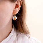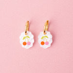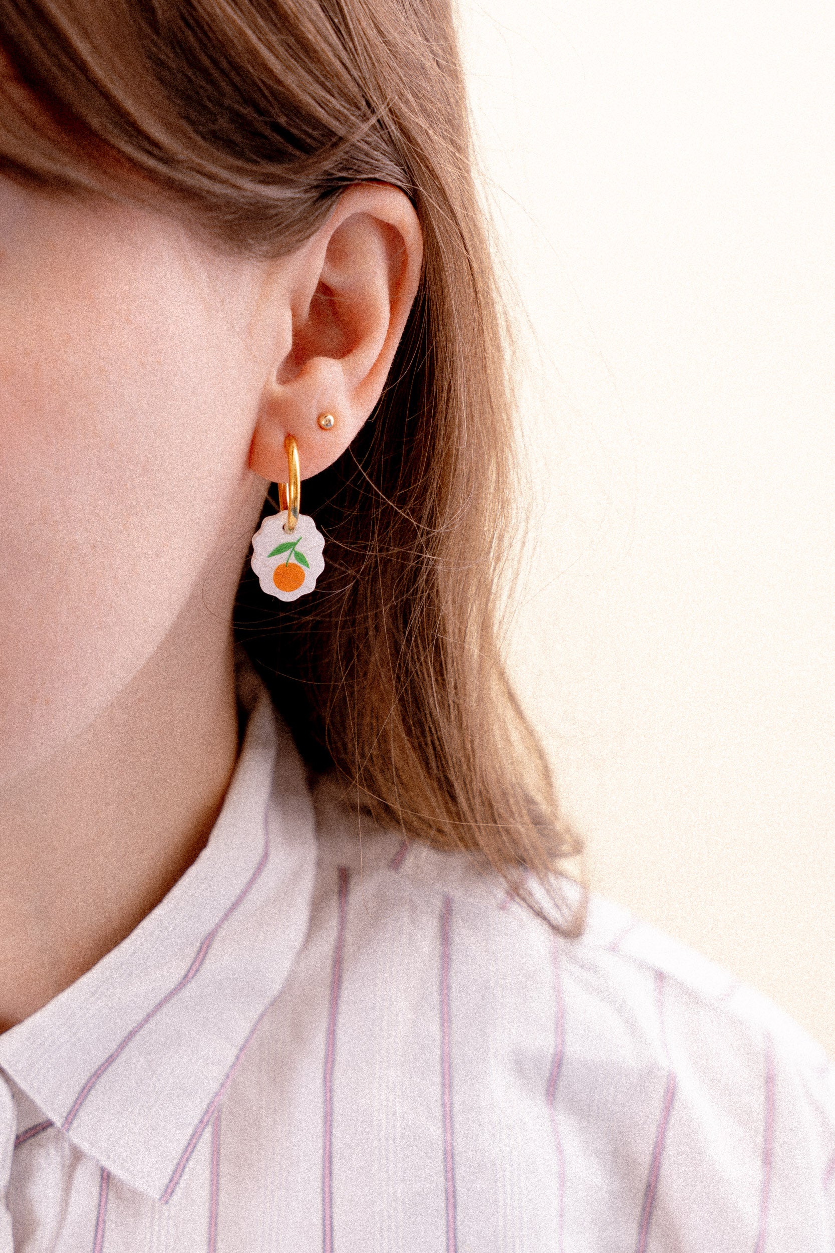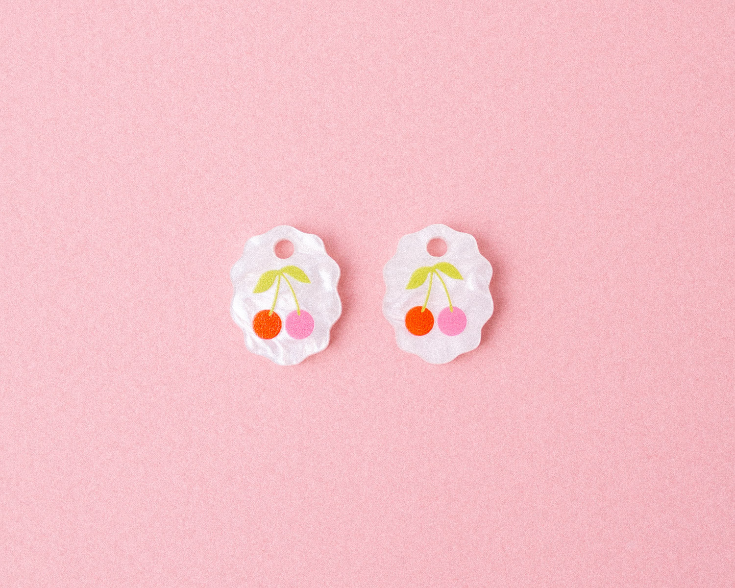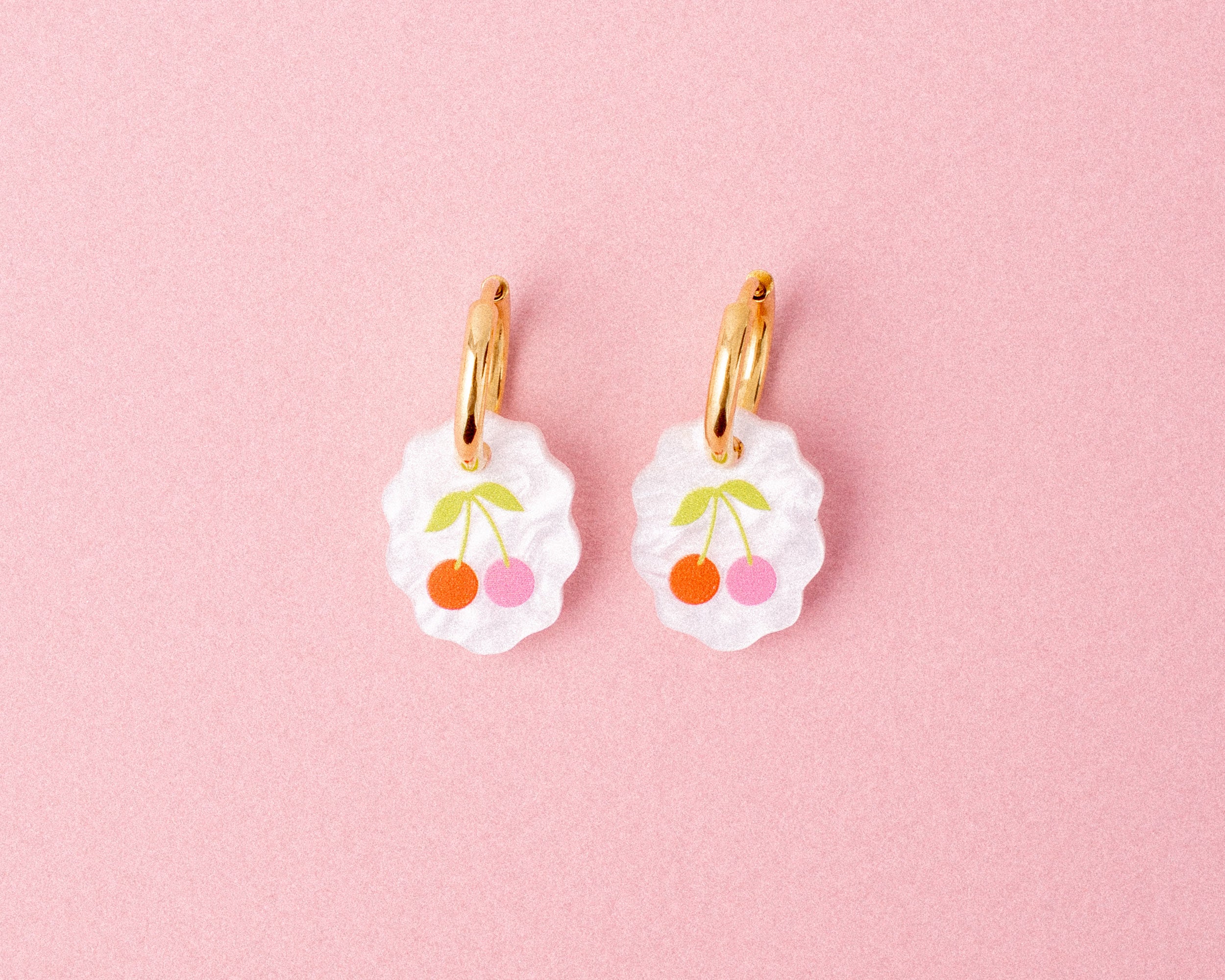 Zwei kleine Kirsch-Anhänger mit Vintage-Anmutung. Die Amulett-Form mit welligem Muschelrand trifft auf ein klares, grafisches Motiv in Pink, Rot und Grün, das auf weißes Acryl mit Perlmutt-Effekt gedruckt ist. Bei unserem süßen Set sind auf Wunsch zwei Ohrringe enthalten. Abgebildet sind die vergoldeten 17mm Hoops.