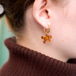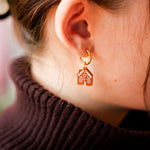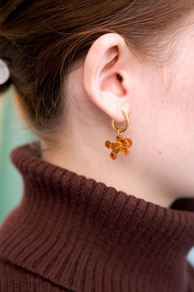 Winterliches Ohrring Set bestehend aus einem süßen Lebkuchenmensch und seinem Lebkuchenhaus aus zimtbraun schimmerndem, zart graviertem Acryl und einem Paar Edelstahl Hoops deiner Wahl.