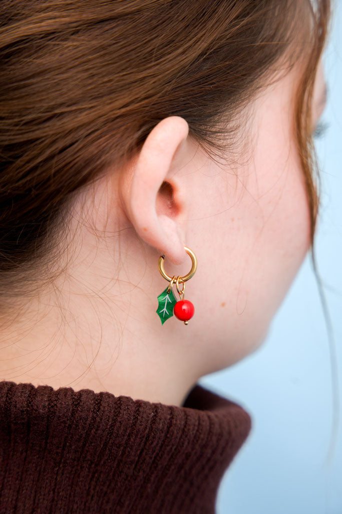 Ein Paar Ohrringe mit kleinen süßen Stechpalmenperlen aus knallroter Glasperle und kleinen smaragdgrün schimmernden Acrylblättern. An jedem Ohrring hängt je eine Beere und ein Blatt.