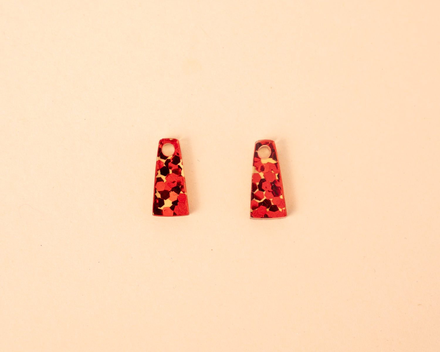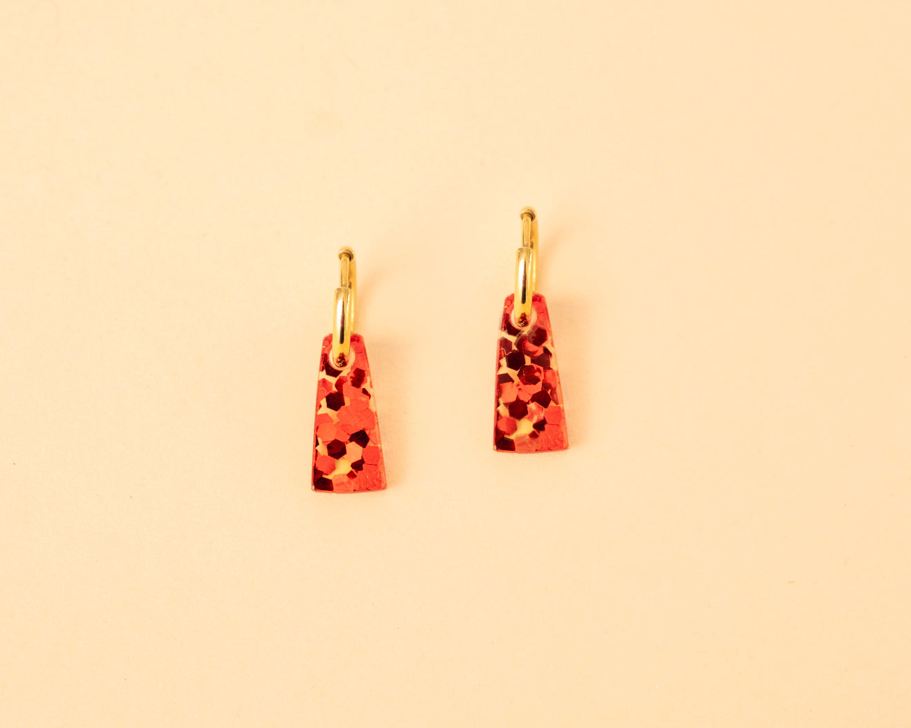 Dezente kleine Trapez Anhänger aus festlichem roten Glitter Acryl und Hoops aus vergoldetem Edelstahl. Dezent und trotzdem glitzernd. Jeder Anhänger ist einzigartig, wir achten aber natürlich darauf, dass deine zwei gut zusammenpassen!