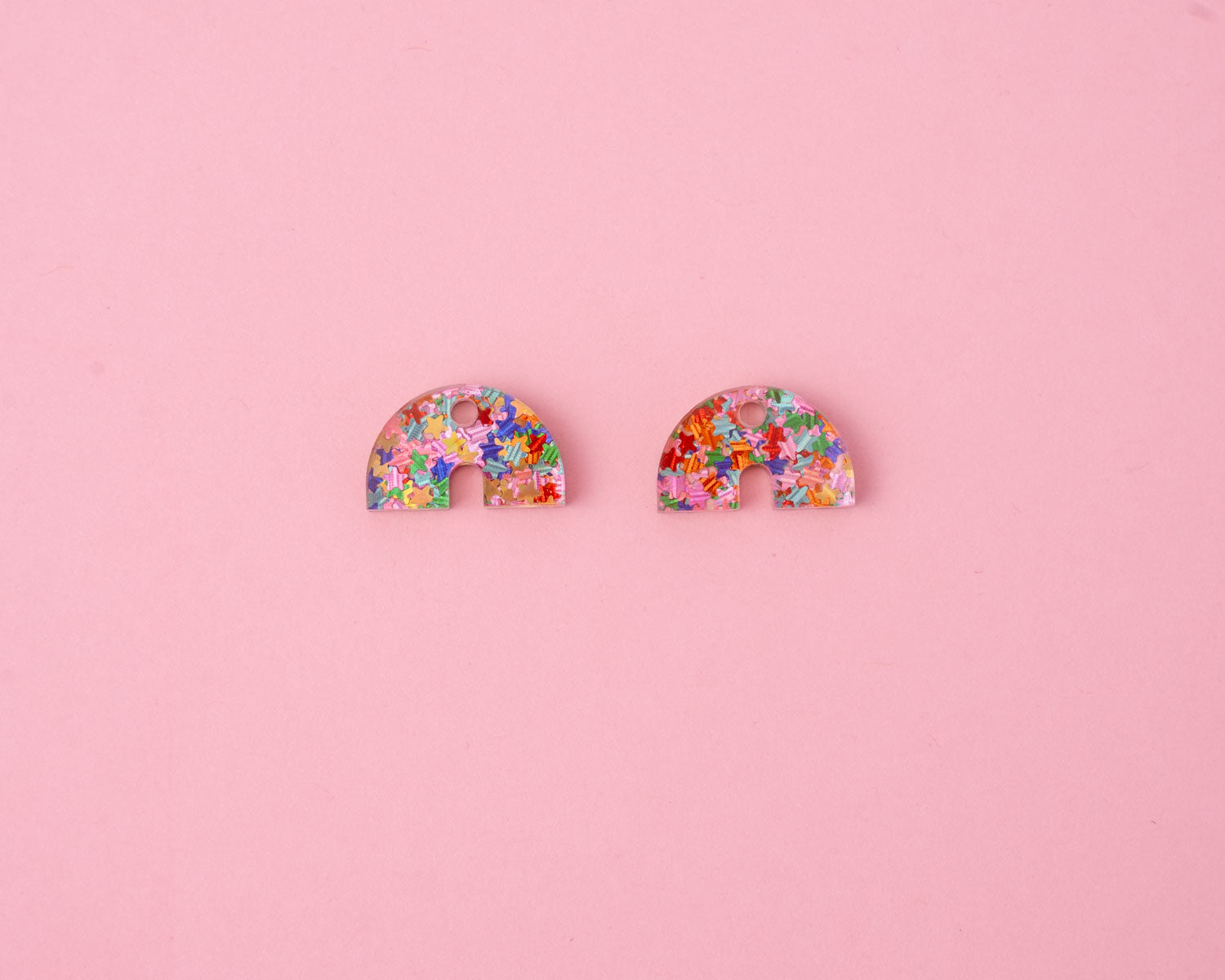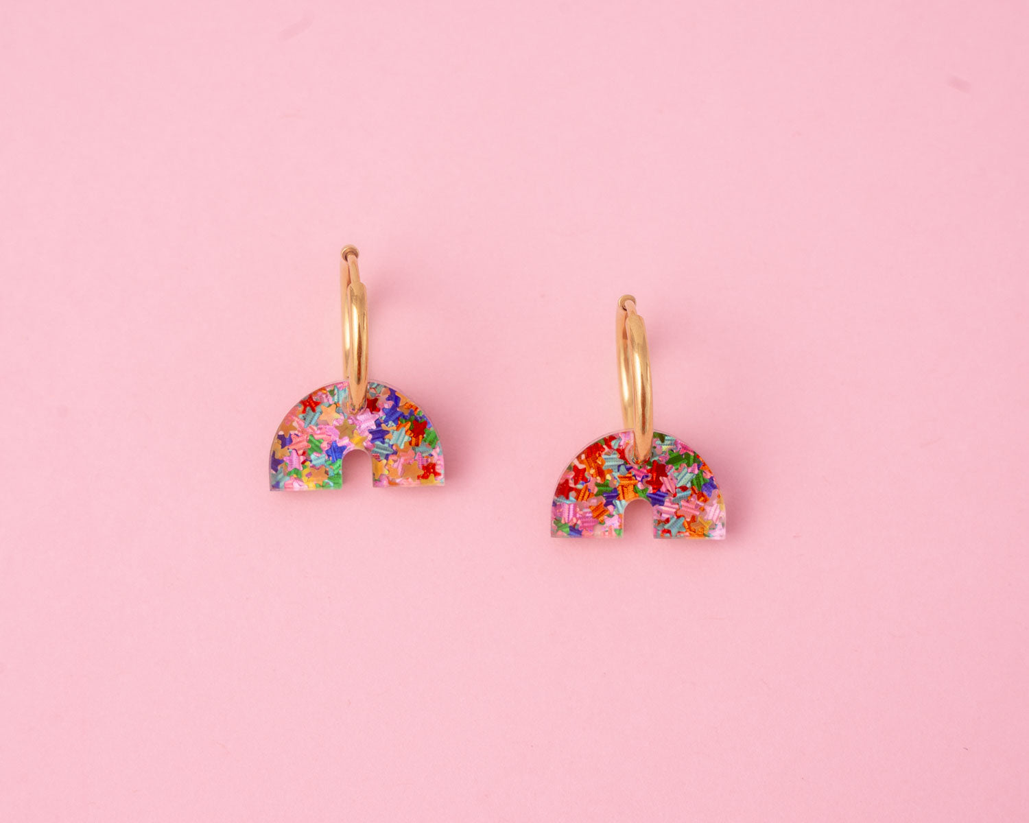 Bei unserem Set sind auf Wunsch zwei Ohrringe enthalten. Abgebildet sind die vergoldeten 17mm Hoops. Die Anhänger sind aus super leichtem und hochwertigen Acryl mit buntem Konfetti-Effekt gefertigt.