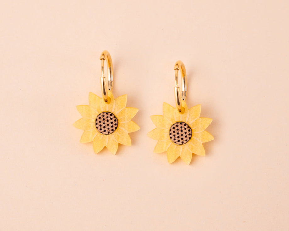 Schimmernde Sonnenblumen aus Perlmuttstyle-Acryl mit einer Mitte aus dünnem graviertem Kork, der das Design gleich auch noch natürlicher wirken lässt.
