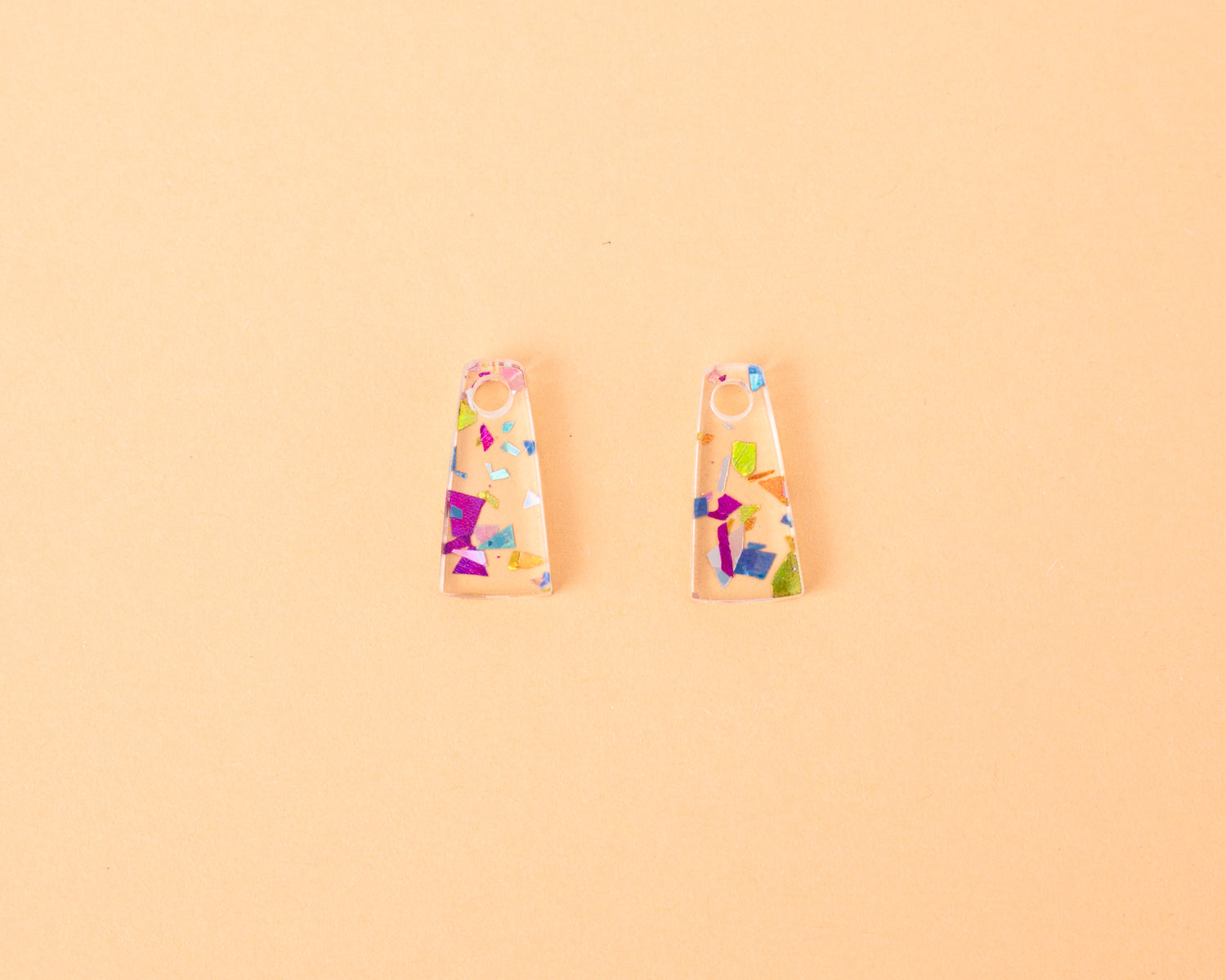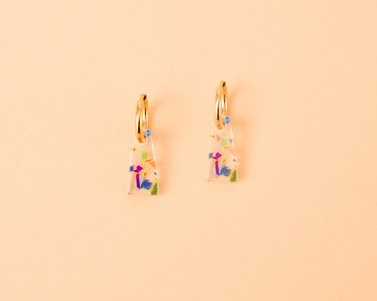 Dezente kleine Trapez Anhänger aus feierlichem Glitter Acryl und Hoops aus vergoldetem Edelstahl. Dezent und trotzdem glitzernd. Jeder Anhänger ist einzigartig, wir achten aber natürlich darauf, dass deine zwei gut zusammenpassen!